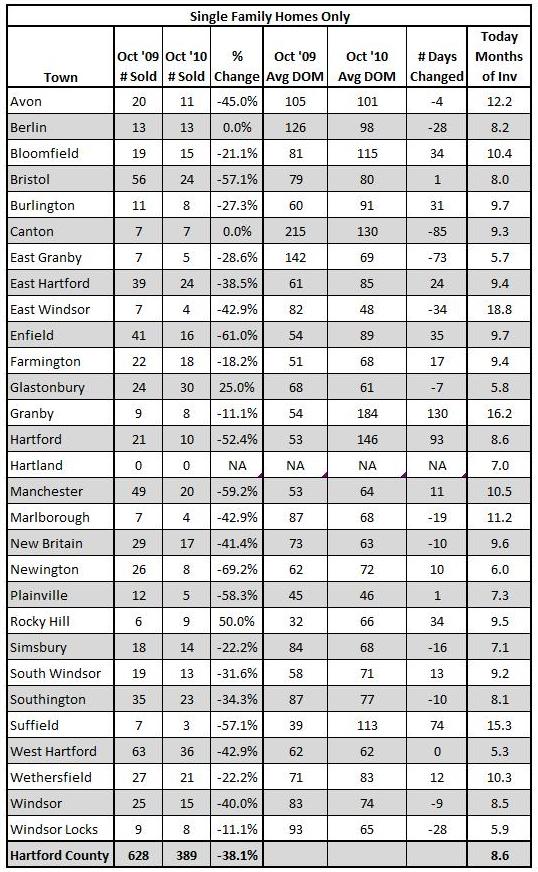 Here’s a quick look at how the Hartford County real estate markets performed last month. Closings in October reflect deals negotiated during the summer and fall depending on the amount of time between the contract date and the closing date. The data comes from the Connecticut Multiple Listing Service (CTMLS), which is deemed reliable but not guaranteed.